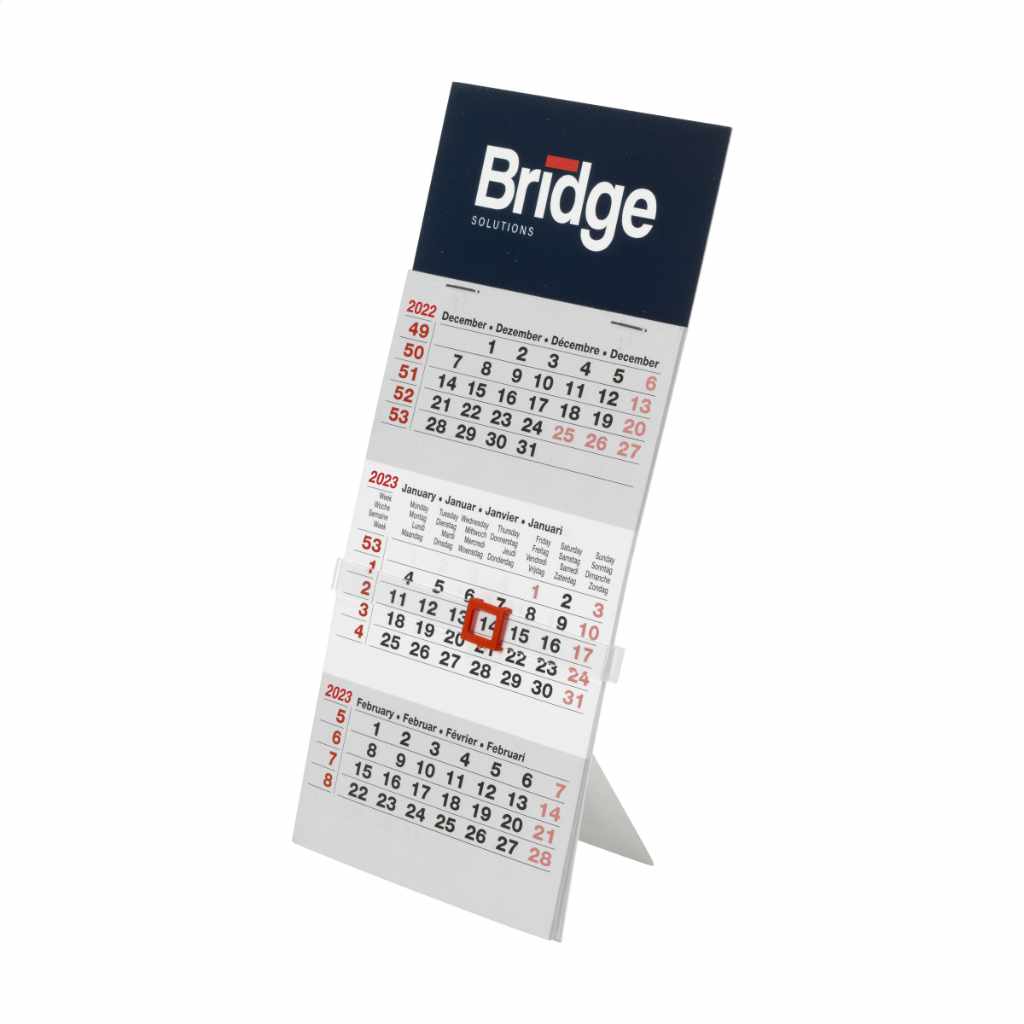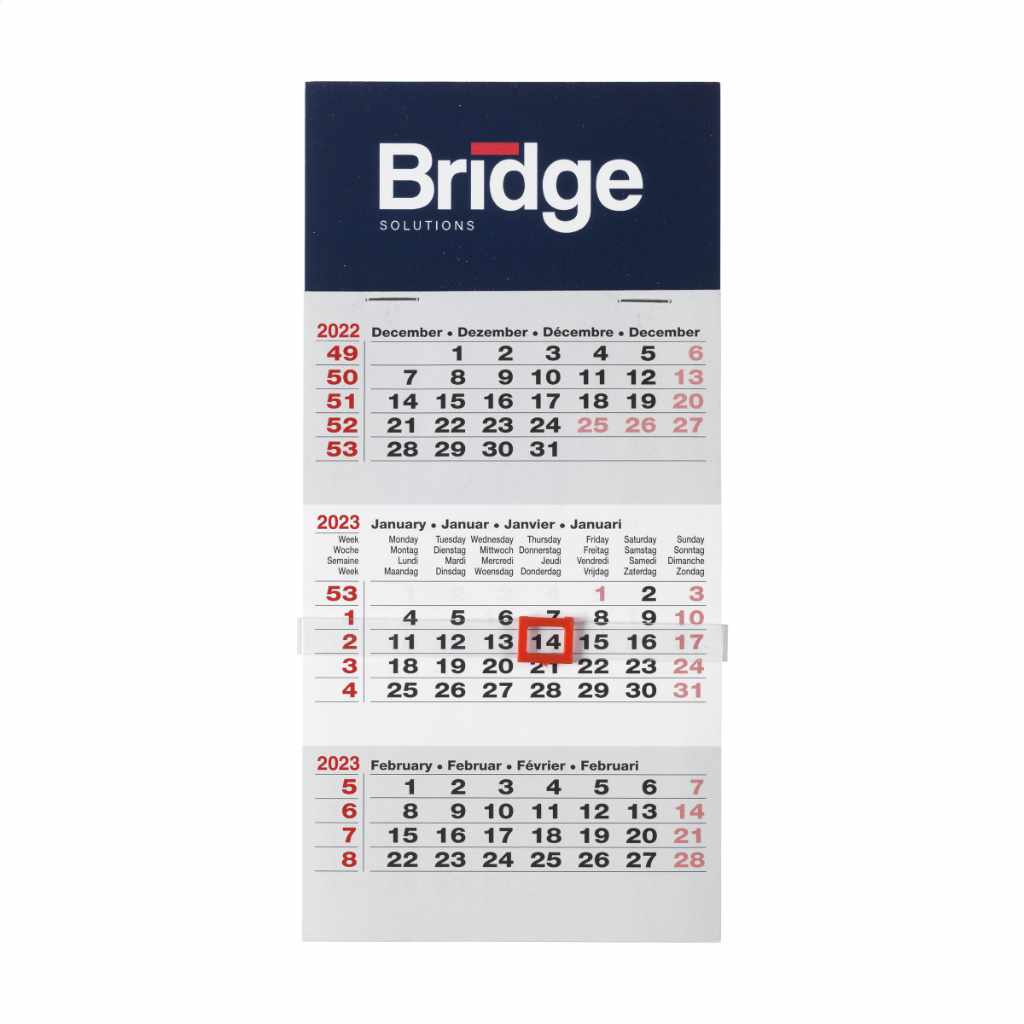 Dieser 3-Monatskalender zeigt Ihnen immer den jeweils aktuellen Monat und dazu noch den letzten und den nächsten. So hat man immer alles bestens im Blick und kann gar nicht noch organisierter sein. Ein auffälliger, roter Kalenderschieber zeigt dabei immer das aktuelle Datum und lässt sich problemlos weiterschieben. Der Kalender ist dabei in vier Sprachen aufbereitet, sowohl in deutsch als auch in englisch, französisch und niederländisch. Also egal ob man einfache Grundlagen einer neuen Sprache nebenbei lernen möchte oder einfach stolz auf seine Fremdsprachenkenntnisse sein möchte… Mit diesem Kalender wird’s möglich. Die letzte Seite des Kalenders zeigt nochmal eine Jahresübersicht 2014/2015 und rundet das Paket ab. Mit einer persönlichen Werbebotschaft und einem individuellen Logo verschaffen Sie Ihren Kunden, Mitarbeitern und Geschäftsfreunden einen umfangreichen Überblick für jeden neuen Monat.