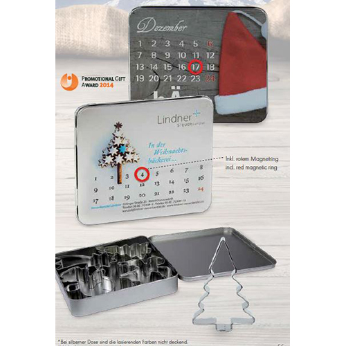 Wer will schon Jahr für Jahr einen ganz normalen Adventskalender? Schenken Sie doch einmal etwas anderes und durchbrechen Sie den normalen Kreislauf mit einer netten Adventskalender-Dose. Ein kleiner roter Magnetring lässt sich täglich weiterschieben und zeigt immer das heutige Datum an. Vier weihnachtliche Backförmchen – ein Engel, ein Baum, ein Stern und ein Schneemann – als Inhalt der Dose lassen dabei die Vorweihnachtszeit noch besser werden. Beim Plätzchen backen und anschließendem vernaschen vergeht die Zeit, bis endlich der 24.12. und somit der Heiligabend mit seinen Geschenken und dem Zusammenkommen der Familien und allem Schönen gekommen ist, wie im Flug. Der Deckel der Dose ist mit einer personalisierten Werbebotschaft individuell und liebevoll gestaltbar und macht die Adventskalender-Dose zu einem Geschenk für die Ewigkeit.