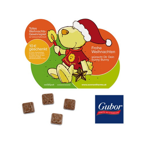 Die Vorderseite des Adventskalenders lässt sich in Form und Druck ganz individuell gestalten. Gefüllt ist der Kalender mit 24 Stück Edel-Vollmilchschokolade in feinster Gubor-Qualiät (50g.) Der Adventskalender ist als Wand oder Tischkalender erhältlich. Die Sonderformen des Deckblatts sind innerhalb des Formats 244 x 344 mm (B x H) oder 344 x 244 mm (B x H) möglich.
