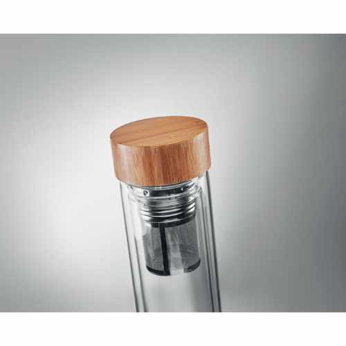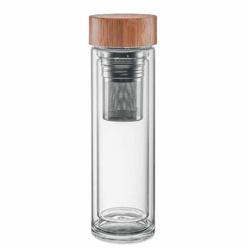 Die doppelwandige Glasflasche ist aus bruchsicheren Borosilikatglas gefertigt und fasst 420 ml. Praktischerweise ist das Teesieb integriert, so wird der Tee to go ein Kinderspiel. Der auslausichere Deckel ist aus Bambus gefertigt und lässt sich per Lasergravur personalisieren.