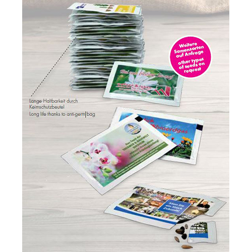 Der eigene kleine Garten zum Mitnehmen. Mit diesen kleinen Tütchen kann jeder seine eigenen Sonnenblumen, Vergissmeinnicht, Sommerblumen oder mehr (siehe Liste) anpflanzen und ihnen beim Wachsen und Gedeihen zuschauen. Der Keimschutzbeutel garantiert dabei lange Haltbarkeit der Samen und ist dank seinem kompakten Format und dem geringen Gewicht ein perfekter Werbebegleiter (Mailingverstärker). Mit einem individuellen und liebevoll gestaltbaren Design ist dieses Briefchen mit Blumensamen nicht nur ein Give-away von kurzer Dauer, sondern beschert Ihren Kunden, Partnern oder Mitarbeitern bei der richtigen Pflege sehr lange große Freude.