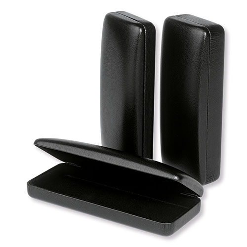 In zwei verschiedenen Größen ist dieses formschöne Hartschalenetui lieferbar. Der Bezug ist aus weichen und glatten Kunstleder und in einem seidig glänzenden Schwarz. Die Schaniere sind, wie auch das Etui aus Metall und sehr robust. So erhalten Sie mit dem Aufdruck Ihres Logos eine schöne und langlebige Werbung. Bitte geben Sie bei der Bestellung die entsprechende Größe an.
