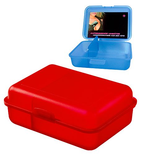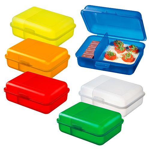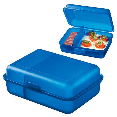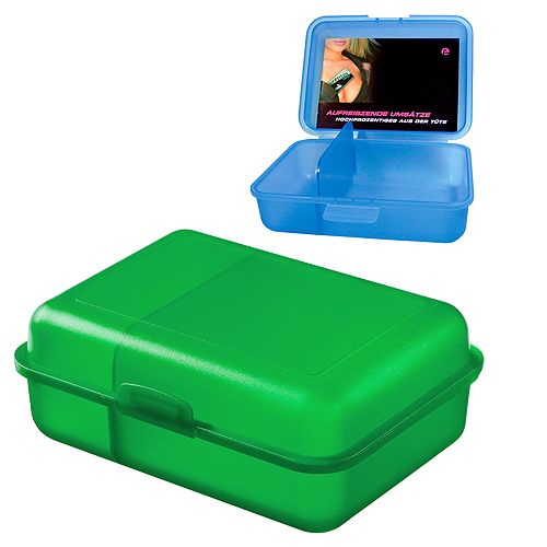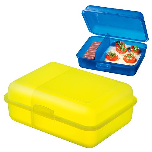2 Fächer in einer Brotdose mit Scharnieren und Verschluss und Abtrennung für Obst. Optimale Pausenbox mit Klickverschluss und Trennwand, ideal für unterschiedliche Lebensmittel. In vielen verschiedenen Farben lieferbar.
