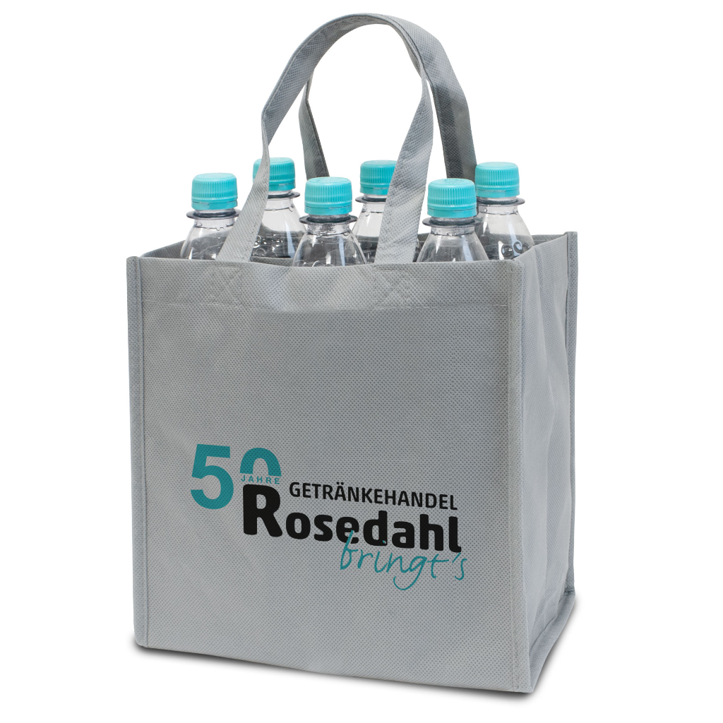 Das Material der praktischen Alltagshelfer ist robust und Wasser abweisend, dadurch ist die Flaschentasche Non Woven für 6 Flaschen langlebig und Ihre Werbebotschaft wird lange durch die Welt getragen. Und günstiger geht Außenwerbung kaum! Auf Werbewänden muss man für die Anbringung der Plakate zahlen, wenn Fahrzeuge mit Ihrer Werbung spazieren fahren kostet das auch schnell eine Stange Geld. Ganz anders mit Tüten und Taschen. Die glücklich Beschenkten freuen sich immer über das nützliche Give Away, um den vielleicht gerade getätigten Einkauf zu transportieren. Und das Beste daran, und genau deshalb sollte man auf gute Qualität und ansprechendes Design achten, dieser Werbeartikel wird wieder und wieder verwendet, spazieren getragen und erreicht dadurch eine breite Masse an Publikum – das ganz umsonst! Die Flaschentasche Non Woven für 6 Flaschen ist in dezentem Grau gefertigt. Der Innenteil, der die sechs Flaschen getrennt hält, um scheppern zu vermeiden, ist herausnehmbar. Einfach die Klettverschlüsse auf beiden Seiten lösen und schon steht eine große Tasche mit stabilem Boden zur Verfügung. Ein guter Werbeartikel nicht nur für Getränke führenden Fachhandel. Falls Ihnen das Grau der Flaschentasche Non Woven fuer 6 Flaschen nicht zusagt, finden wir gerne eine Alternative in Ihrer Wunschfarbe.