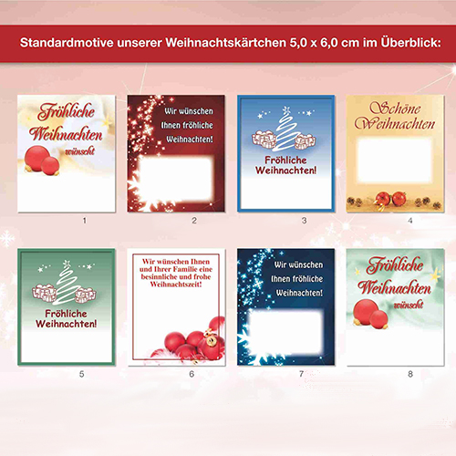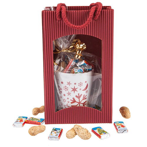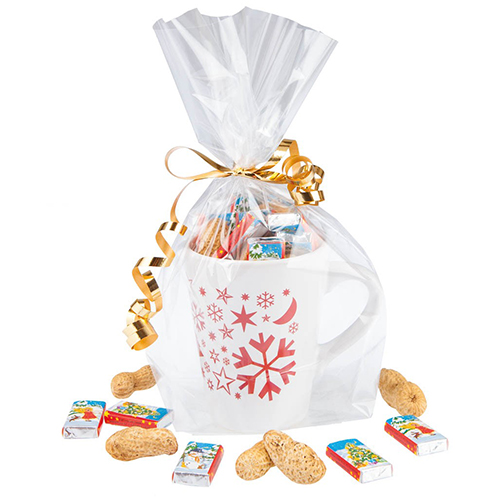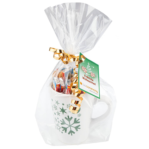 Weihnachtlich verpackt mit goldener Schleife in Cellophan Folie ist die Keramiktasse mit Weihnachtsdruck ein nettes kleines Präsent zum Fest. Die Tasse gibt es in grün oder rot. Der große Becher ist gefüllt mit Erdnüssen und Vollmilch-Schokoladen-Naps. Das Anhängekärtchen mit Ihren Weihnachtsgrüßen können Sie individuell gestalten oder Sie wählen aus einem unserer acht Standartmotive, natürlich wird auch hier Ihr Logo angebracht.