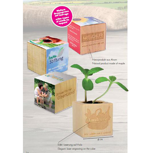 Eine außergewöhnliche Geschenkidee mit wundervollem Inhalt. Ein Würfel aus echtem Ahornholz mit einer innenliegenden Substrahltablette und beiliegende Blumensamen aus verschiedensten Samensorten machen es ganz einfach, sich seine eigene kleine Pflanze zu ziehen. Einfach die Tablette mit Wasser begießen, Samen drüber streuen und der Natur ihren Lauf lassen. Mit einem individuellen Logo, wahlweise auf einer Rundum-Banderole oder dem Holzwürfel selbst, ist dieses Give-away perfekt um jeden Aufenthaltsraum, jeden Meeting-Tisch oder jedes Büro noch etwas aufzuhübschen und zu einem noch angenehmeren Arbeitsplatz zu machen.