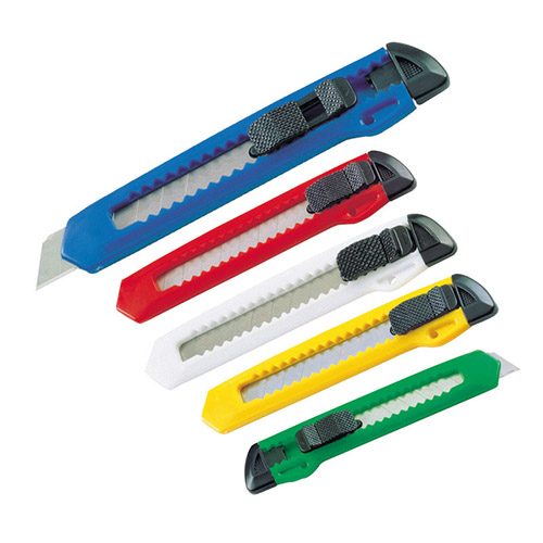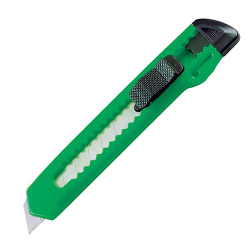 Großes Kartonmesser aus Kunststoff in vielen kräftigen Farben verfügbar, mit abtrennbarer und auswechselbarer Feststellklinge. Das absolute Muss für den Handwerker. Ihren gewünschten Werbedruck platzieren wir mittig auf dem Cutter.