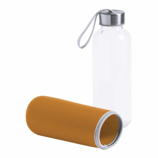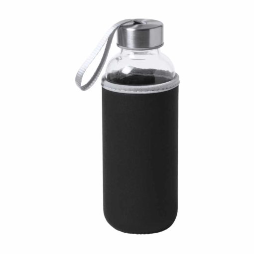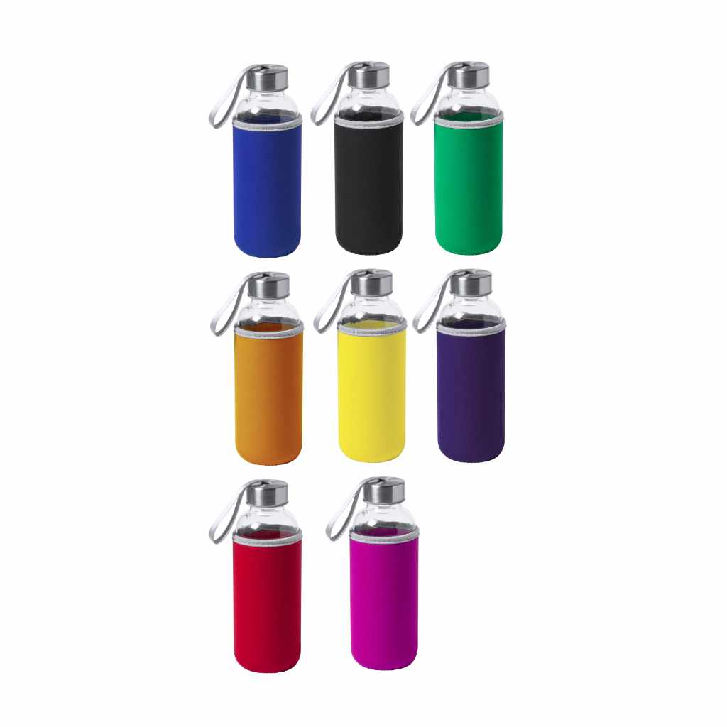 Die Trinkflasche aus Glas fasst 400 ml und ist durch die Neopren-Hülle gut geschützt. Zudem Isoliert diese kalte und warme Getränke. Das Sleeve ist bedruckbar und in verschiedenen Farben lieferbar. Durch die praktische Trageschlaufe, die an dem auslaufsicheren Edelstahdeckel befestigt ist lässt sich die Flasche angenehm transportieren. Der Verschluss und die Glasflasche sind ebenfalls personalisierbar.