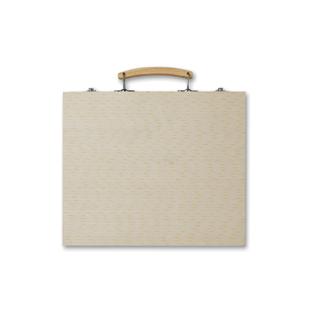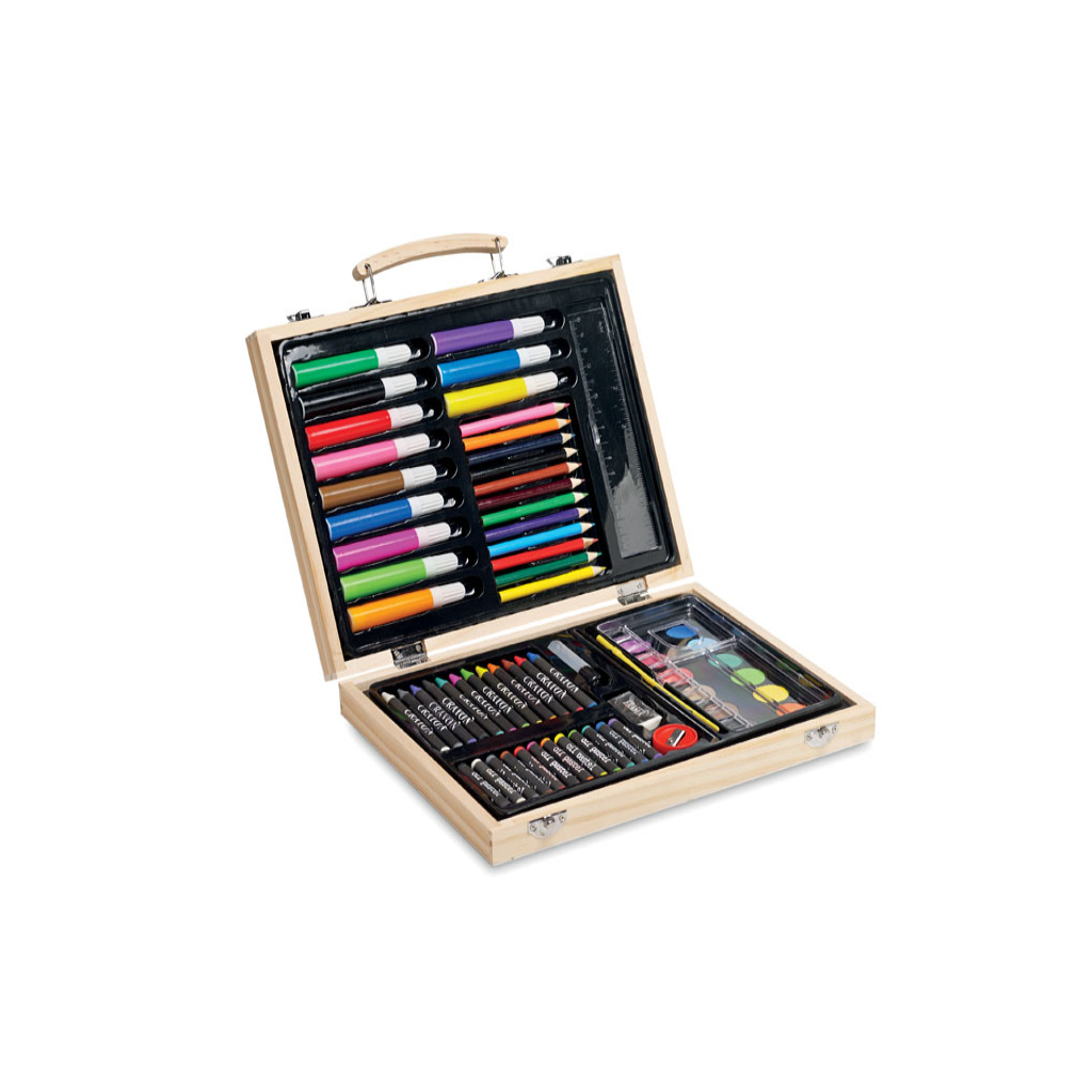 Künstlerset in hölzerner Box inklusive 67 Stiften für kreatives Zeichnen. Mit Buntstiften, Filsstifte, Radiergummi, Spitzer, Lineal, Wachsmalkreide, Pinsel und Wasserfarben.