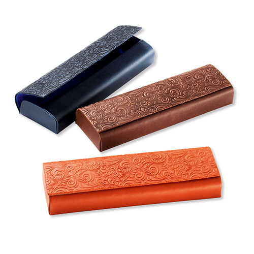 Die flachen halbharten Brillenetuis mit Magnetverschluss sind mit synthetischem Leder überzogen und haben eine wunderschöne Ornamentprägung mit floralem Muster. Die qualitativ hochwertigen Etuis haben einen Magnetverschluss und sind mit einem farblich abgestimmten Innenfutter ausgestattet. Erhältlich sind die luxuriösen Etuis in einem schönen warmen Braunton, einem satten Schwarz und einem dezentem Orange. Die drei Varianten kommen im Farbmix zu Ihnen. Auf Anfrage ist bei größeren Mengen eine farbige Sortierung möglich.