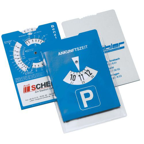 Die Parkscheibe aus Karton darf in keinem Auto fehlen, wird es doch teuer ohne sie in gekennzeichneten Flächen zu Parken. Der praktische Helfer entspricht § 42 der StVO. Sie haben die Wahl zwischen der schlichten Ausführung und der Parkscheibe mit Benzinrechner. Dieser ist auf der Rückseite untergebracht, so halten können die Kosten für Treibstoff ganz einfach berechnet werden. Um die Karton Parkscheibe zu schonen, besteht die Möglichkeit eine Klarsichthülle zusätzlich zu bestellen. Die Werbeanbringung erfolgt vorschriftsmäßig auf der Rückseite der Parkscheibe. Dieser Parkscheiben sind in Deutschland hergestellt.