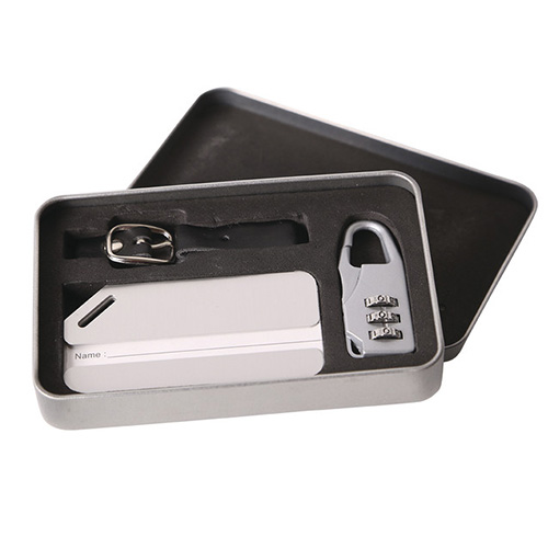 In der schönen matten Metallbox ist alles enthalten was Ihre Kunden für den Reisekoffer benötigen. Ein Kofferanhänger aus Aluminium, mit verstecktem Adressfeld und ein einstellbares Zahlenschloss zum Abschließen des Gepäcks. Das Set ist eine nette Aufmerksamkeit über die sich Ihre Kunden mit Sicherheit freuen. Ihr Logo wird im Tampondruck, Digitaldruck oder mit Lasergravur auf die Metallbox angebracht.
