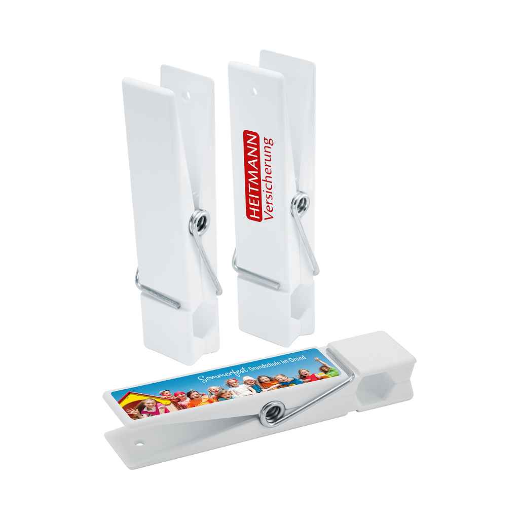 Die Riesen-Klammer hält mehrere Papierseiten und wichtige Terminsachen zusammen. Auf der einen Seite befindet sich ein Loch mit dem Sie die Klammer aufhängen können. Der Zettelhalter ist aus weißem Kunststoff in Deutschland hergestellt und bietet eine große Werbefläche. Mit der Riesen-Klammern – Made in Germany ist Ihre Werbebotschaft immer im Blick der Beschenkten und hält Ordnung.