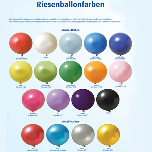Ausserdem gibt es Zeppelin-Ballons mit 160 cm Länge (ca.ø 30 cm) und ein Riesenherz mit 225 cm Umfang (ca.ø 70 cm) oder 300 cm Umfang (ca.ø 110 cm). Es gibt die XXL-Ballons in 14 verschiedenen Farben (siehe Farbkarte) und in 4 Metallicfarben.