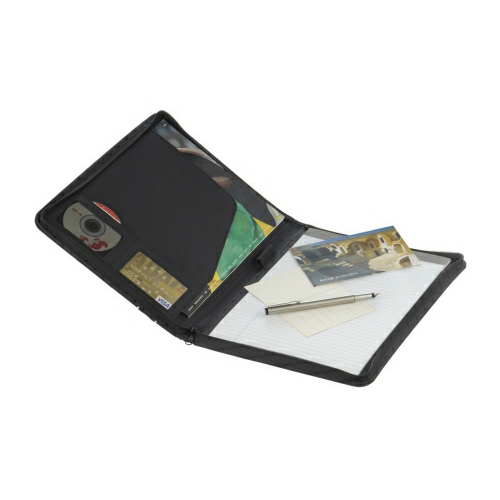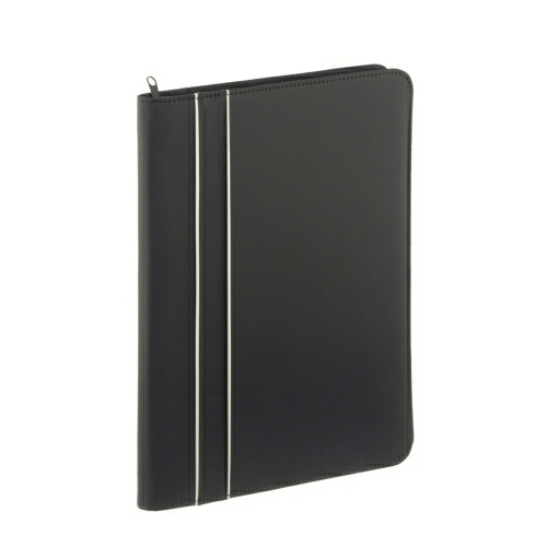 Schreibmappe in DIN A4 mit 4 Steckfächern, inklusive Block, mit Rundumreißverschluss aus schwarzem Softkunststoff mit edlem weisser Applikation.