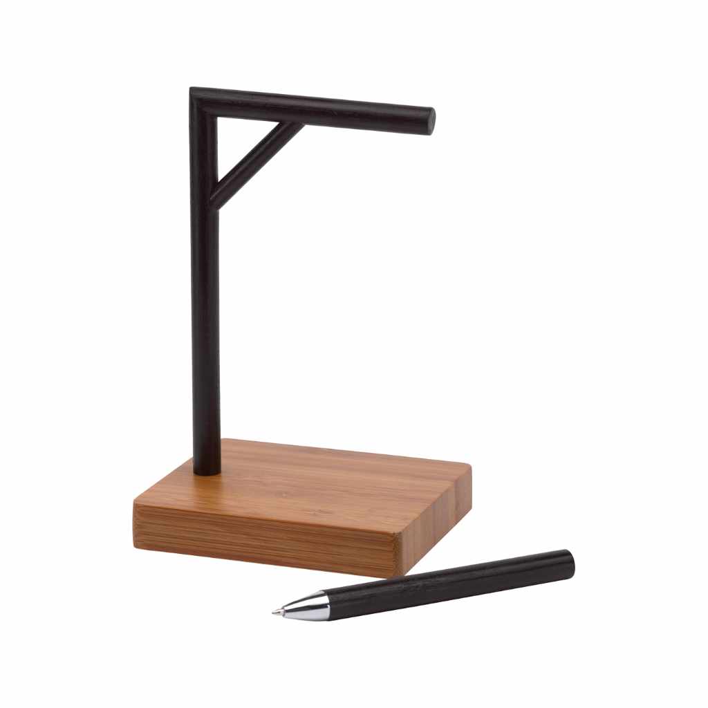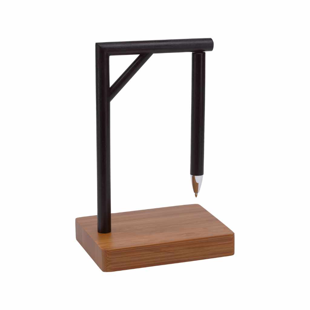 Dieser freche Stiftehalter erinnert an das Spiel Galgenmännchen und mag für manche etwas makaber wirken. Aber er sorgt dafür, dass man nie wieder seinen Kugelschreiber verlegt und genau dann keinen Stift zur Hand hat, wenn man dringend einen bräuchte. Der Galgen lässt Sie nicht hängen. Aus robustem Stahl, mit magnetischem Kugelschreiber und auf einem Podest aus Bambus schaut das pfiffige Accessoire nicht nur auf Schreibtischen gut aus. Mit einer persönlichen Werbebotschaft ein nettes Gadget sowohl für Viel- als auch für Wenig-Schreiber.