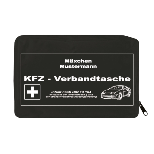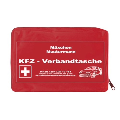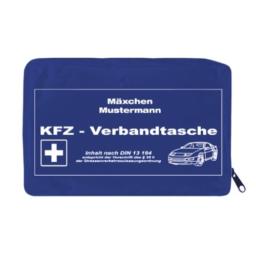 Verbandstasche aus Nylonmaterial mit Reißverschluss, mit Verbandsmaterial nach DIN 13164. Wir drucken Ihr Logo oberhalb der Pflichtangaben.
