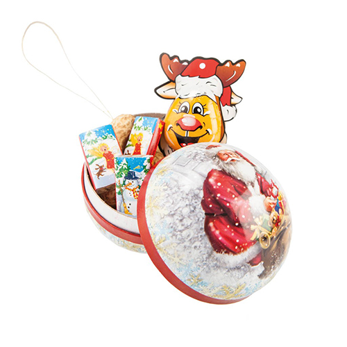 Die im Durchmesser ca. 8 cm große Weihnachtkugel ist mit nostalgischen Weihnachtsmotiven bedruckt. Gefüllt ist die dekorative Verpackung mit einem Schoko-Rentier, drei Schokoladen-Naps und Erdnüssen. Eine runde Sache für Nostalgiefans, Leckermäulchen, Weihnachtsgrüße und Ihre Werbung. Die wird übrigens an einem Anhängekärtchen angebracht, individuell gestaltet oder ausgewählt aus unseren Motiven.