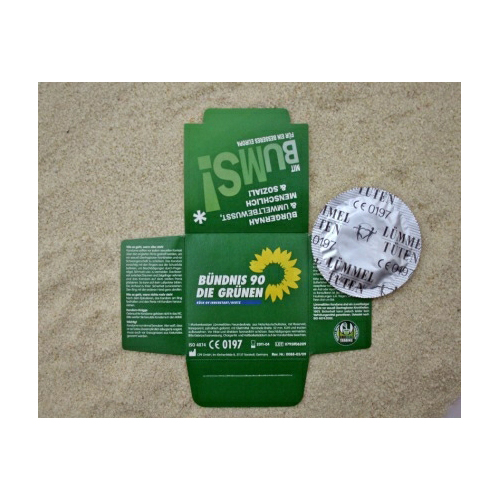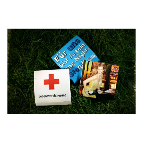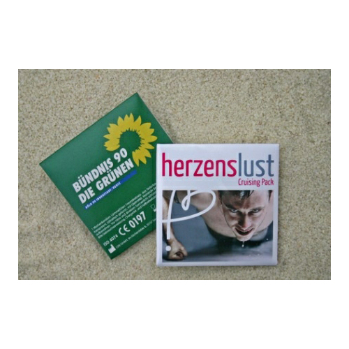 Je ein Sico Kondom aus deutscher Produktion – alternativ ein Lümmeltüten Kondom, aus fair gehandeltem Latex, rund foliert (Aufpreis 0,03€ je Stück).